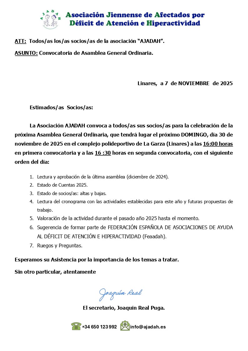 La asociación AJADAH informa a nuestros socios y socias que el 30 de noviembre de 2025